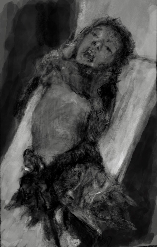 Sketch from eyewitness photo. A young girl torn apart by a #Russia shell today in #Ariha #Idlib #Syria . Her mother was heard weeping over her little broken body “I am sorry I sent you to school!” #Assad and #Russia murder #civilians in front of our eyes. @MarkCutts @leloveluck