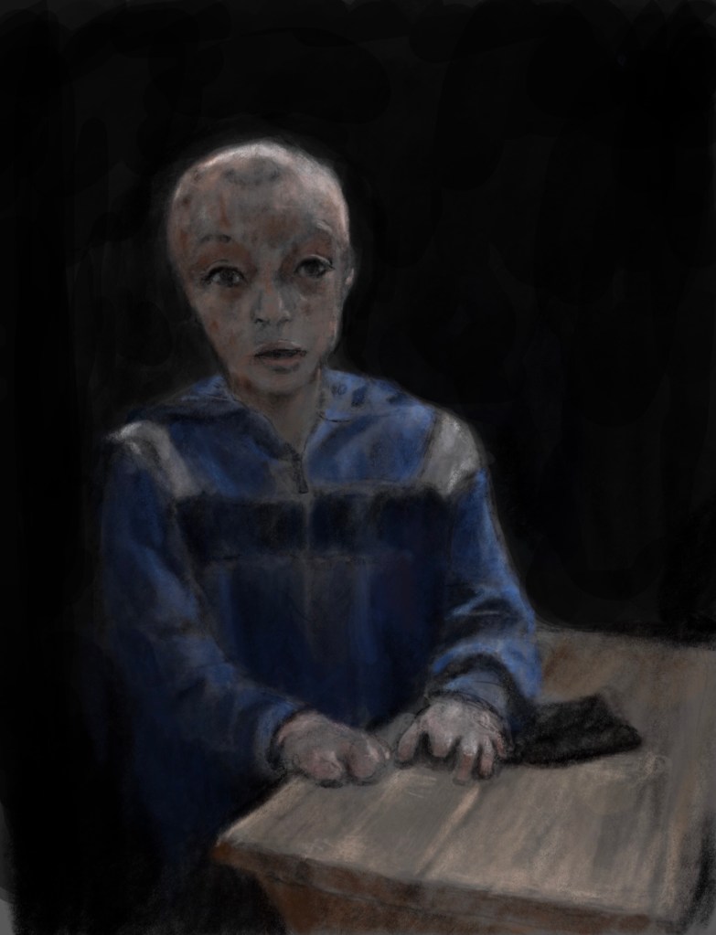 Sketch. Via @SyriaCivilDef Abdullah Biasi was displaced with his family in 2012 after #Assad massacred his village. In 2019 #Assad killed Biasi’s father and 4 brothers with internationally banned #phosphorus . Biasi and his mother were severely burned. @HolocaustMuseum @hrw