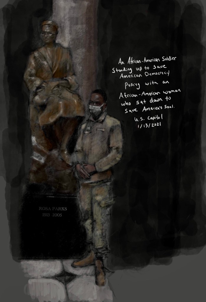 Sketch inspired by photo by Joshua Roberts/Reuters. An African American soldier standing up to save American Democracy posing with an African American woman who sat down to save America’s soul. #USCapitol #RosaParks #MLK @Reuters @HolocaustMuseum @aiww