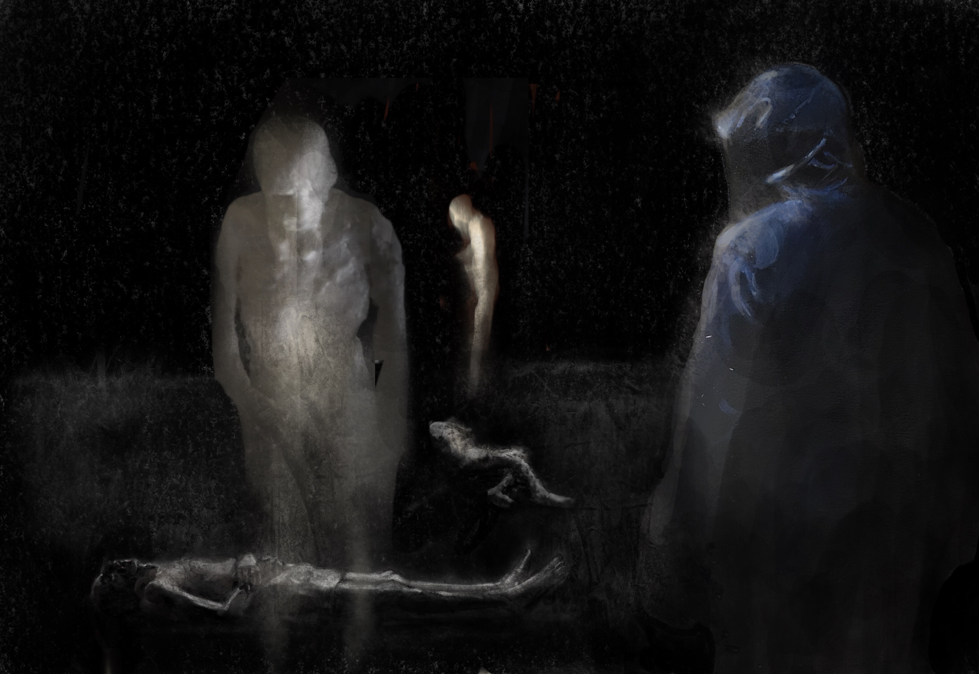 Sketch (sculpture installation,drawing, oil paint). “Visitation”. From @garancelecaisne “Operation Caesar” : Caesar: “ I was simply terrified. The things I had seen during the day would pass before my eyes. I could see my brothers/sisters as one of the corpses”. @HolocaustMuseum