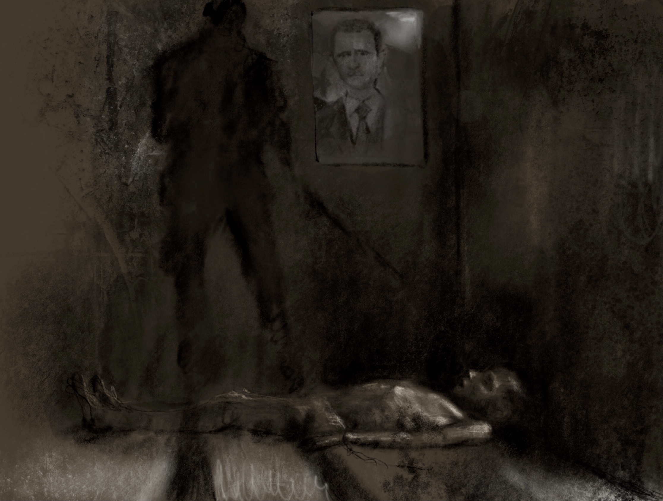 Sketch. Based on testimony from a survivor of #Assad ‘s torture dungeons, as interviewed by @ScottPelley on @60Minutes . The survivor described the hellish sounds of a child being tortured to death in the next room. All under #Assad regime orders. #AssadToTheHague
