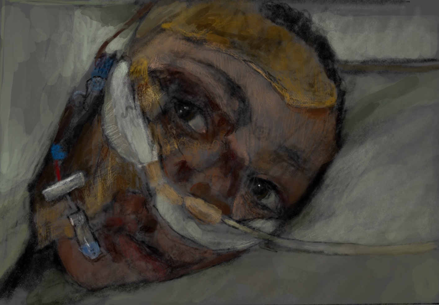 Sketch from eyewitness video by @dcinfocus (@BBCNews), filming in 2013 when #Assad airstrike hit a school. One of the victims, Seeham, begged the world to stop attacks on civilians, as she lay dying on a hospital bed.Just a few days ago #Assad #Putin targeted a hospital.