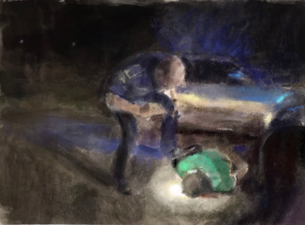 Sketch from #LouisianaPolice #bodycam withheld by authorities 2 yrs, shows police beating, stunning, and dragging #RonaldGreene facedown on the ground before his death.Troopers initially told his family he died on impact after crashing into a tree.Via @NPR