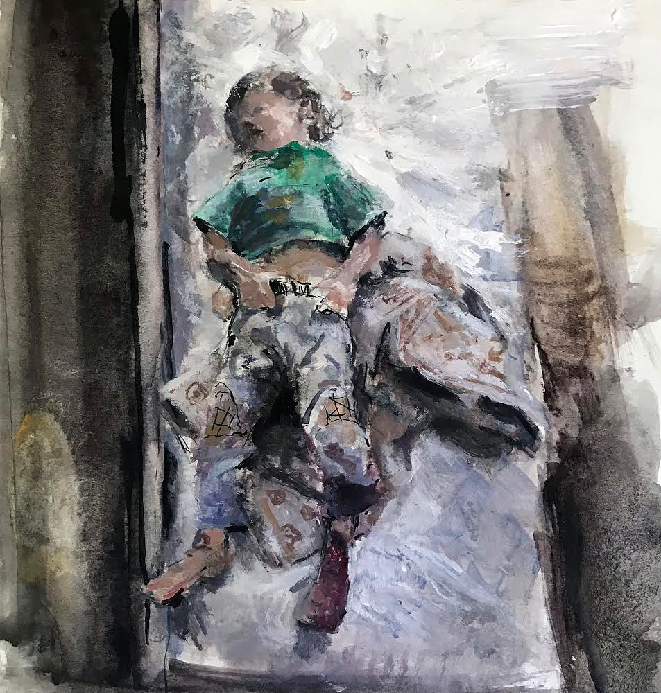 Sketch from eyewitness photo (gouache, ink, acrylic.) A terrified, wounded, child, one of the many victims in this week of unmitigated #Assad attacks on #civilians and #hospitals in #Idlib #Syria . #Assad ‘s “election”, and legitimization by world leaders fuels the killing spree.