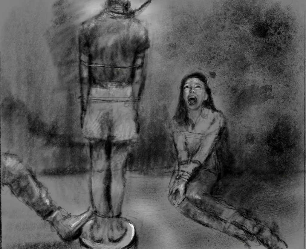 Sketch from witness testimony: #Assad prisons #Syria‘Yara’s’ son was beaten, kicked and threatened with hanging unless she confessed. The interrogators even made her son stand on a chair with a noose around his neck and they pretended to pull the chair away.Via @ldhr_org