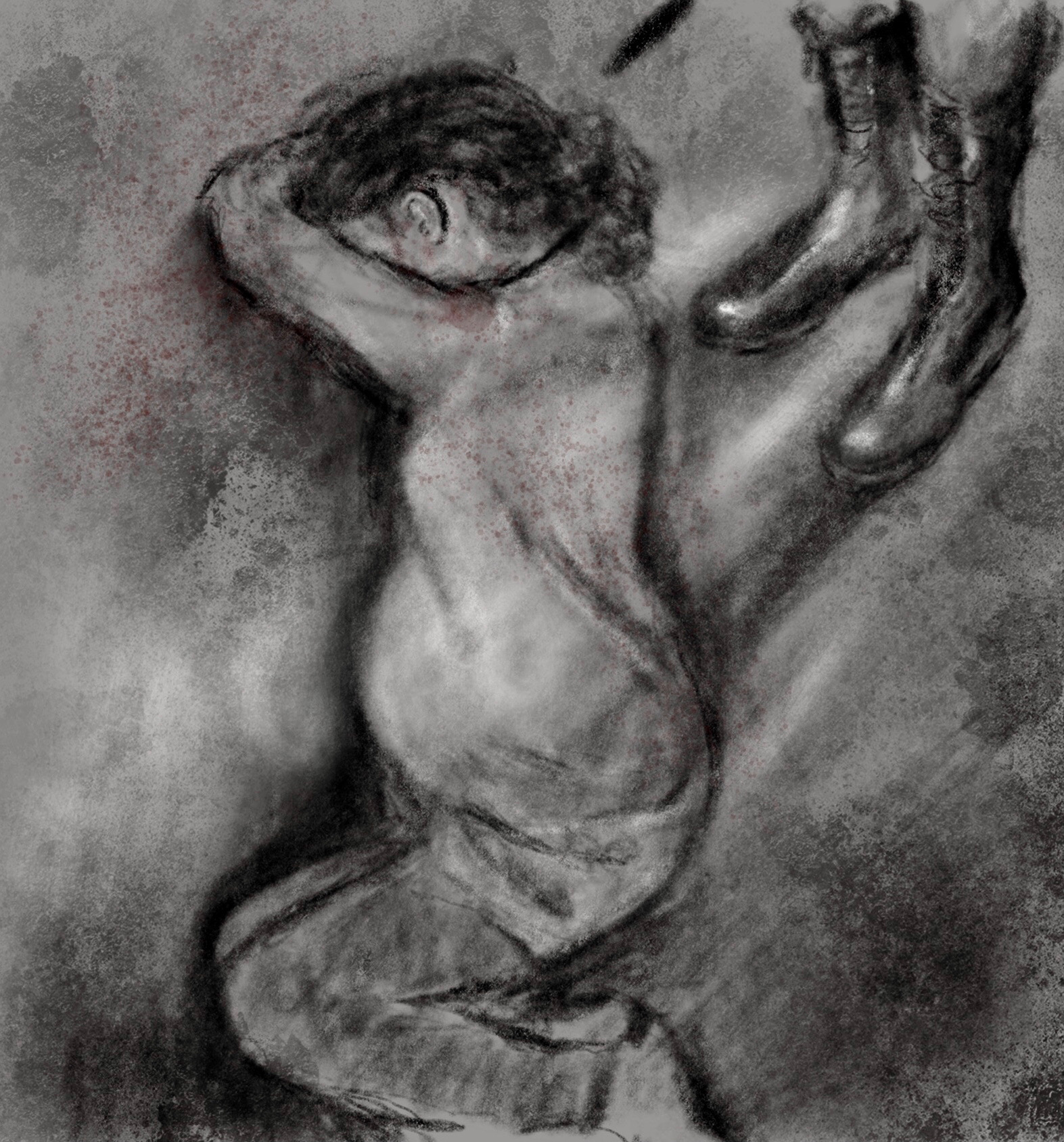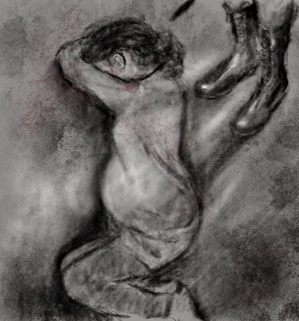 Sketch from testimony of ‘Tuka’ (pseudonym), survivor of #Assad ‘s torture prisons“She begged for mercy due to her pregnancy. Her interrogator punched her in the belly, and then stomped on it with his military boots. “Via @ldhr_org@WHO @denmarkdotdk @KenRoth@RonanLTynan