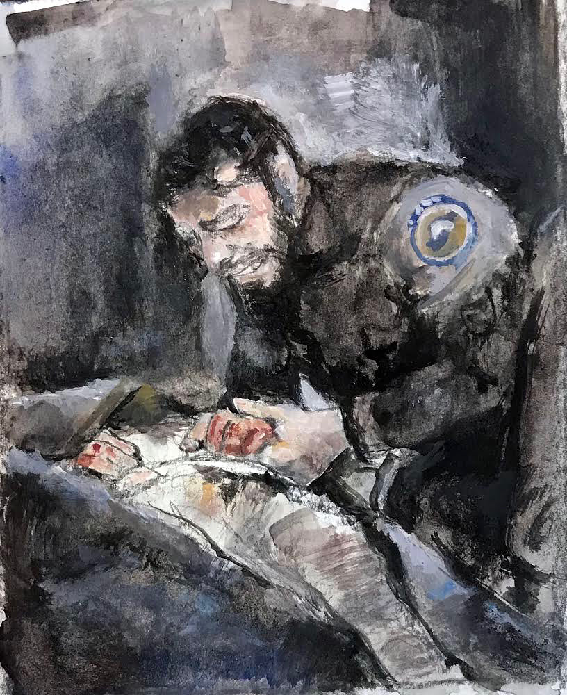 Sketch from eyewitness photo (gouache, ink, acrylic, homemade watercolor) “Today we mourn our 290th fallen hero, “Daham Al-Hussein” who lost his life this morning after a direct artillery shelling on his center in #Hama . Our condolences to his family. Our hearts are with them. #NotATarget #Syria “Via @SyriaCivilDef