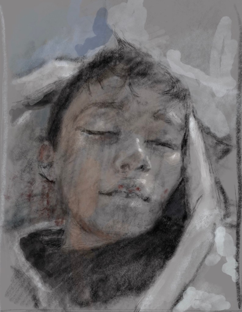 Sketch from eyewitness photo. Today this young boy was one of several children murdered by #Assad #Russia laser guided shells in #Idlib #Syria. What did this child do on his last morning alive? Did he tease his sister? Kiss his mother? Watch a bird drink from a puddle? @WHO