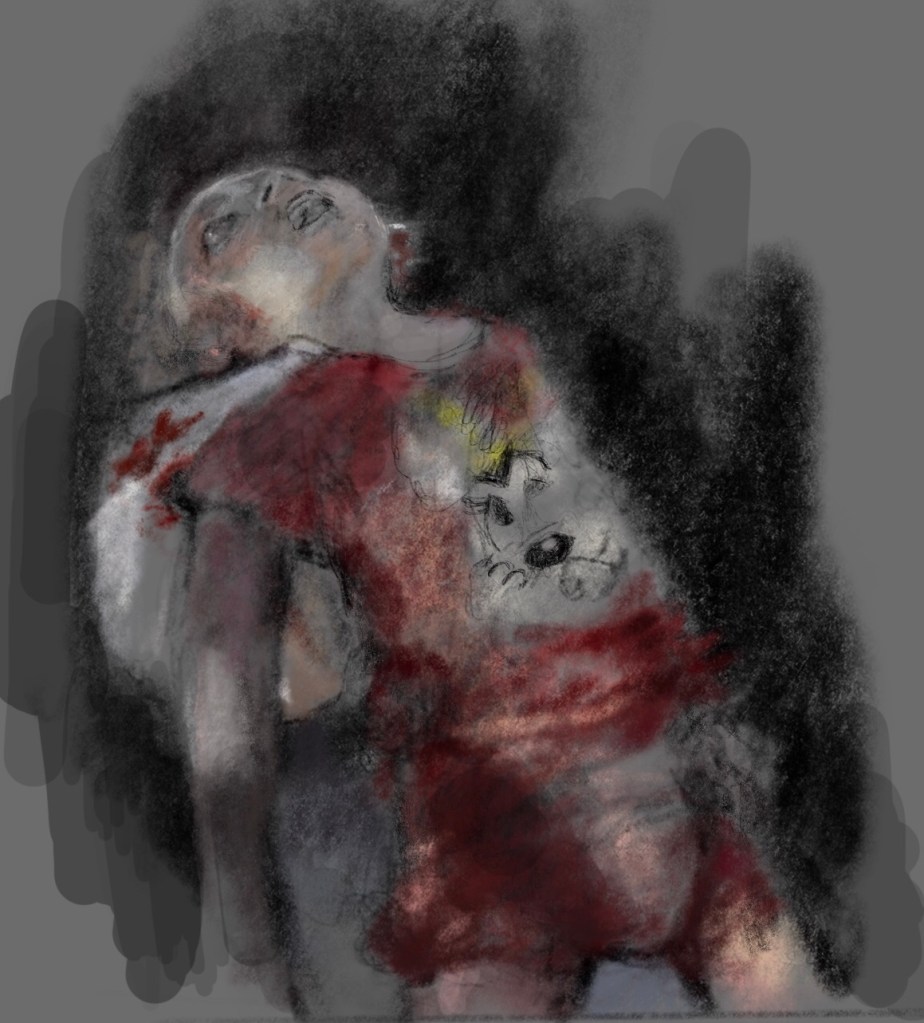 Sketch from eyewitness photo. TODAY! In #Daraa #Syria, this little girl, along with at least 18 others was murdered by #Assad #Russia bombs. This morning she was dressed in a cute #MinnieMouse onesie,and now she is gone. All she knew was war. @SyriatvN