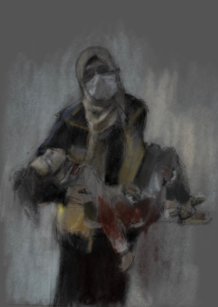 Sketch from eyewitness photo. A @SyriaCivilDef #WhiteHelmets volunteer carries a child, horribly wounded, when #Assad #Putin directly targeted a busy market in #Ariha #Syria . Four children were murdered, along with their teacher. Many wounded, countless traumatized. #WarCrimes