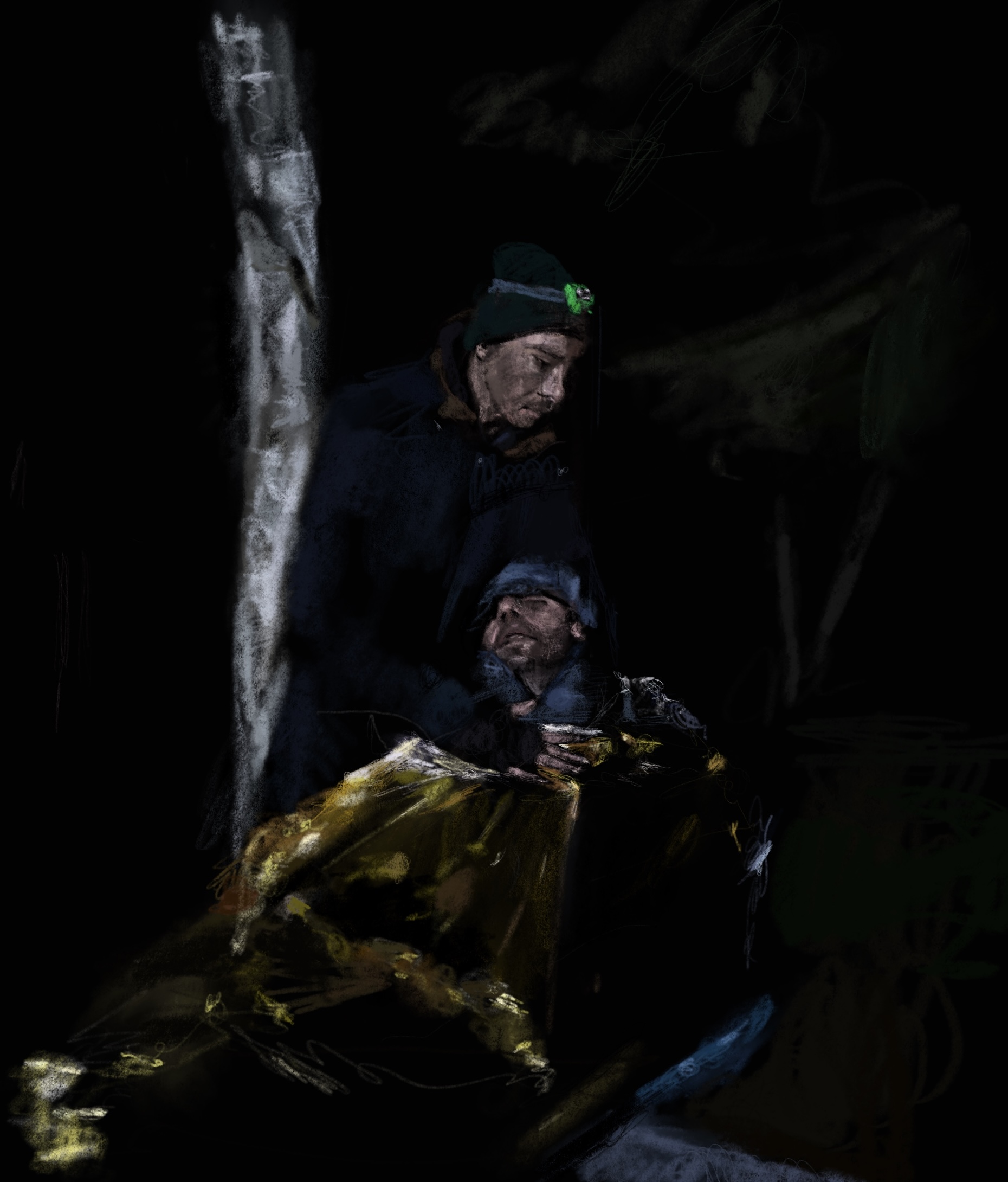 Sketch from eyewitness photo (Maciej Moskwa / Testigo Documentary)Michał of Fundacja Ocalenie saving a #refugee from freezing to death at the #Poland #Belarus border. People like Michal are what I’m thankful for everyday. #Thanksgiving2021@FundOcalenie