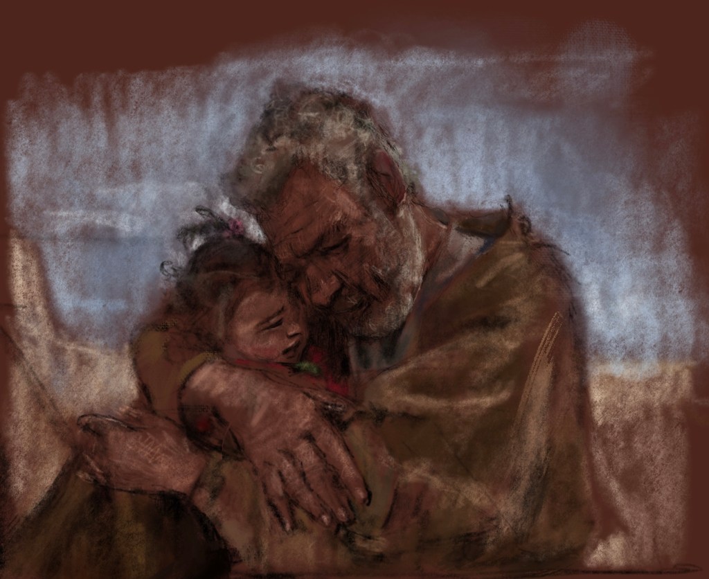 Sketch from photo by Ammar Alzeer. A #refugee grandfather protects his young granddaughter from the frigid gusts, after their tent was destroyed by torrential wind. They have been displaced from their houses by #Assad , but their true home is in each other’s arms. #Idlib #Syria