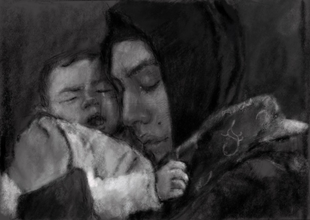 Sketch from eyewitness photo. A #Syrian #refugee mother and child on the beaches of #Lesvos #Greece 0 December 25, 2021 Written by marcnelsonart Christmas RefugeesWelcome Always. Share this: Share on Facebook (Opens in new window) Facebook Share on X (Opens in new window) X Like Loading...