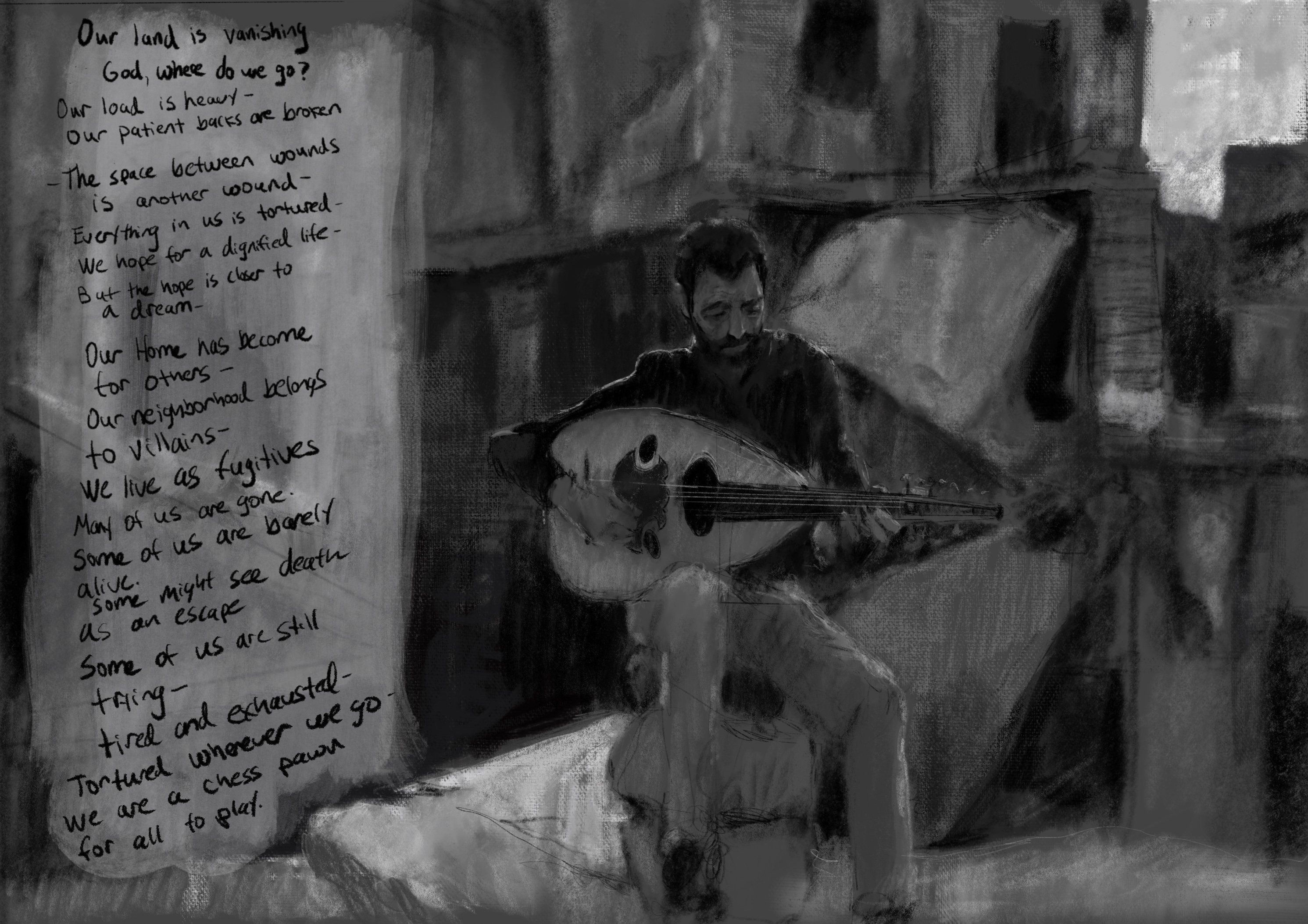 Sketch from a video by FAREED AL فريد المحلولBlessed by the poets, musicians, and artists of #Syria , who transform the pain and destruction inflicted by #Assad and #Putin into a powerful, inspiring, indictment of #evil.Musician: Samir AktaaPoet: Zafer Saleh Al-Sadqa