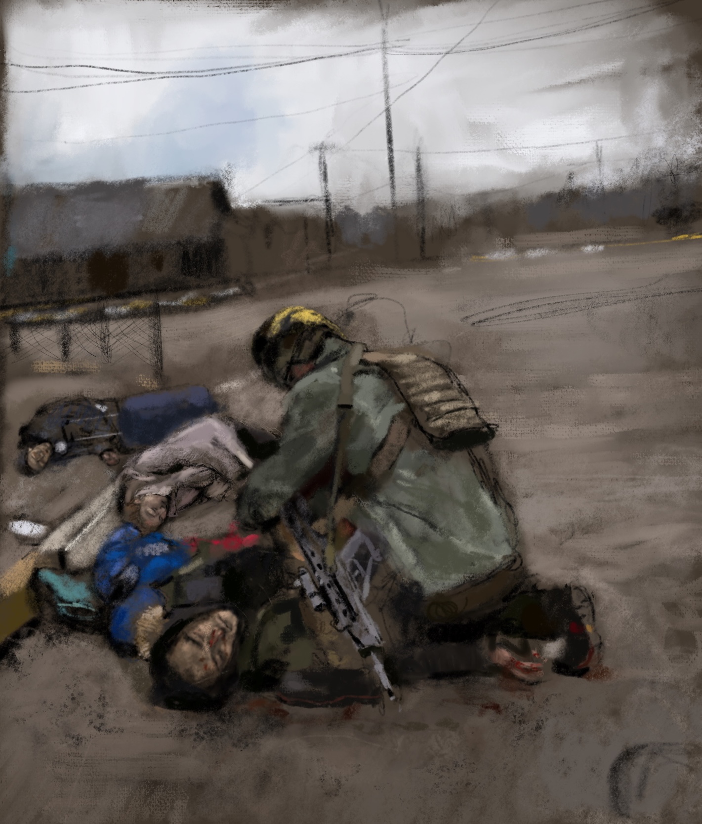 Sketch from eyewitness photo (@lynseyaddario @nytimes ).“Ukrainian soldiers trying to save the father of a family of four — the only one at that moment who still had a pulse — moments after being hit by a mortar while trying to flee #Irpin, near #Kyiv, on Sunday.”