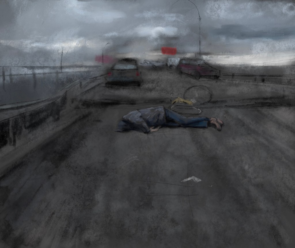 Sketch from eyewitness photo (@OzKaterji ) 0 March 8, 2022 Written by marcnelsonart Irpin #Ukraine “Utterly horrifying scenes here in Irpin. The body of a man is left lying on the road in front of the bridge, the volunteers have deemed it too dangerous to attempt to move his body just yet.” – Oz PutinWarCrimes Share this: Click to share on Facebook (Opens in new window) Facebook Click to share on X (Opens in new window) X Like Loading...