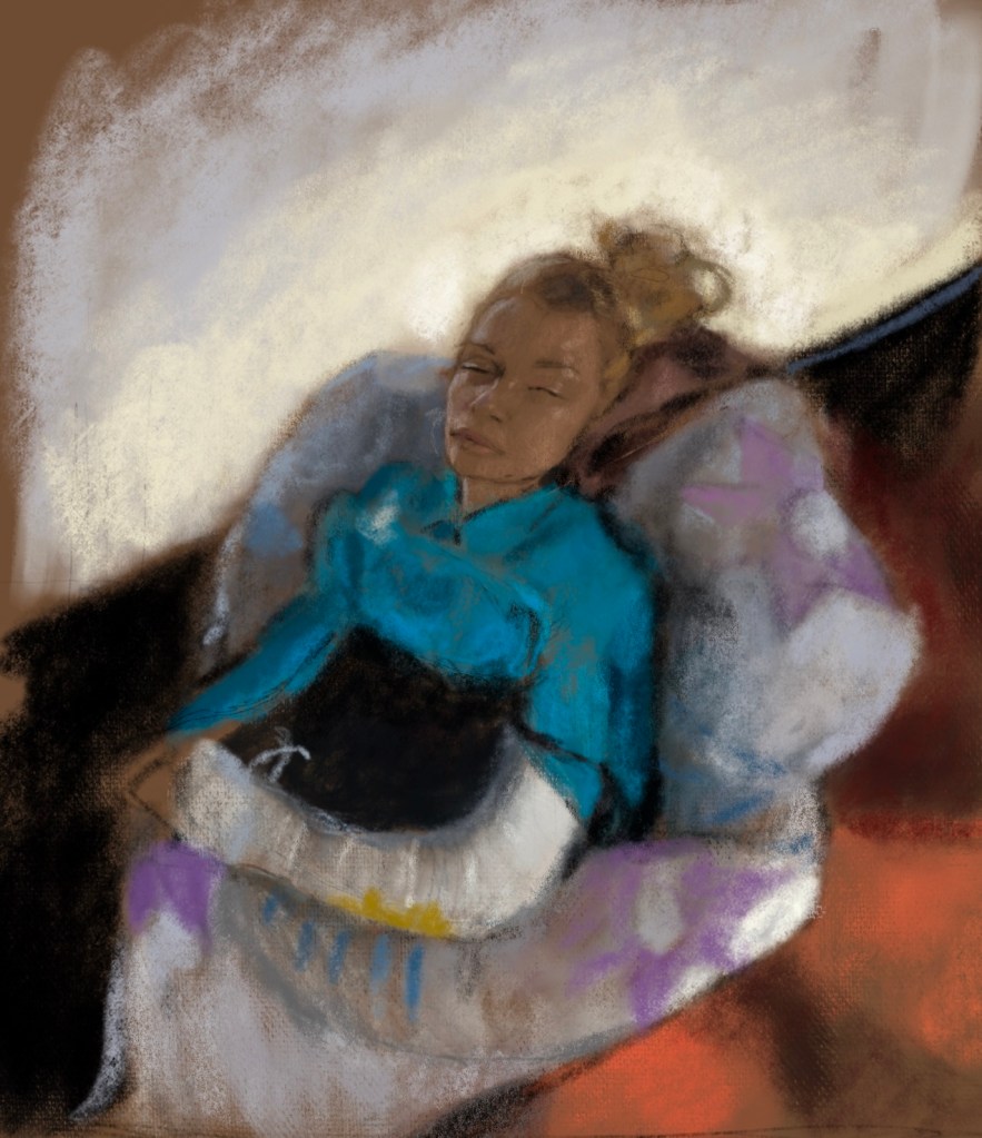 Sketch from photo by my friend Dr. Zaher Sahloul of @MedGlobalOrg from a medical mission to #Ukraine . A young, wounded, traumatized, woman witnessed her mother bleed to death after #Russia #Putin opened fire on her families car, which was clearly marked “civilian”.