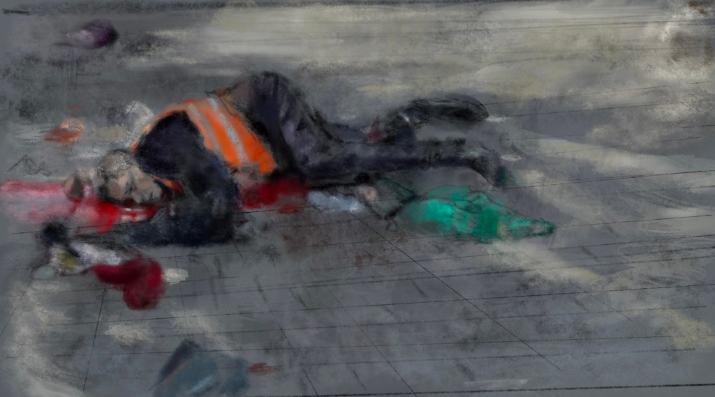 Sketch from eyewitness photo, #KramatorskMassacre #Ukraine .Horrifying news as #Putin appoints #Russian Gen. Aleksandr Dvornikov, who deliberately murdered thousands of #civilians in #Syria , to commit more #RussianWarCrimesInUkraine . #Putin must be stopped. @johnsweeneyroar