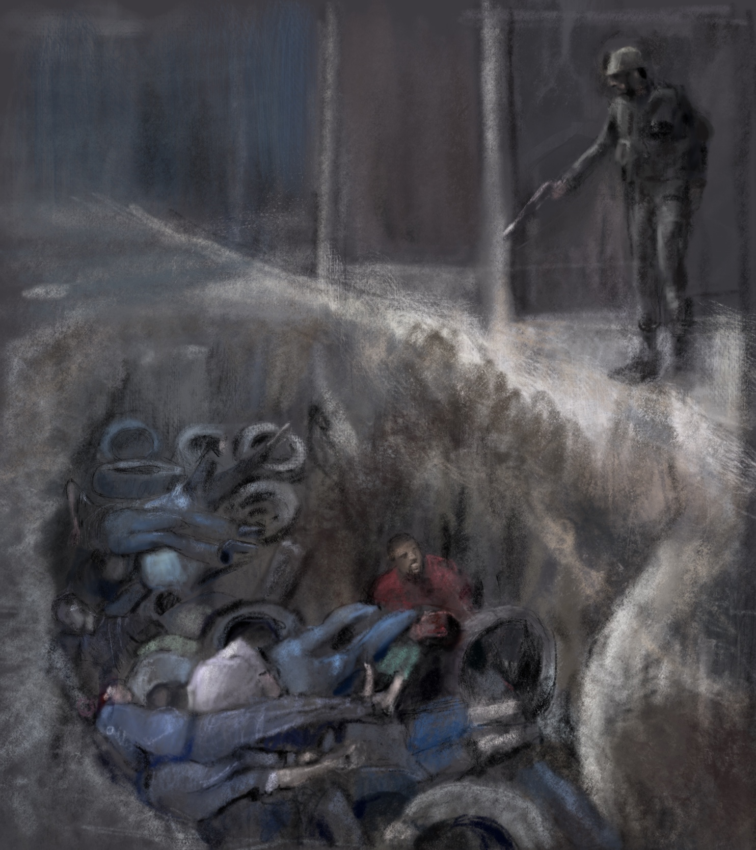 Sketch from leaked eyewitness video. A hellish peak into the murderous depravity of the #Assad regime. 2013 a massacre of 300 #civilians , shot as they were forced to jump into a mass grave #Assad thugs then used tires to burn the “evidence” #Tadamon_massacre #Syria @OzKaterji