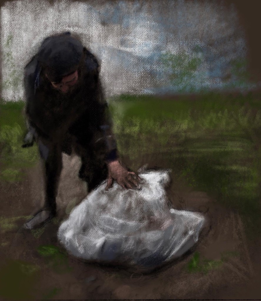 Sketch from photo by @cguzy Olga Kotenko weeps over the only remains of her son Volodymyr murdered by #Russian tank as he tried to deliver humanitarian aid to #MalaRohan #Ukraine. I thought of #KatheKollwitz ‘s etching ‘The Battlefield’ This grief is hell.