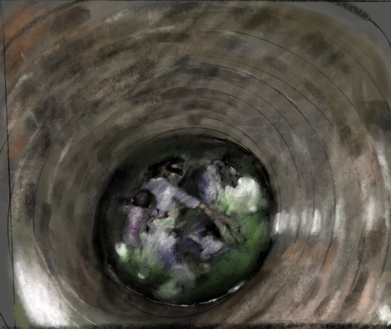 Sketch based on eyewitness testimony. 9 yrs. ago today, a genocidal massacre took place in #RasmAlNafi #Aleppo #Syria . #Assad regime and #Iran allies, murdered over 200 #civilians . They were blindfolded and thrown into a well, then covered with dirt.via @snhr @Charles_Lister