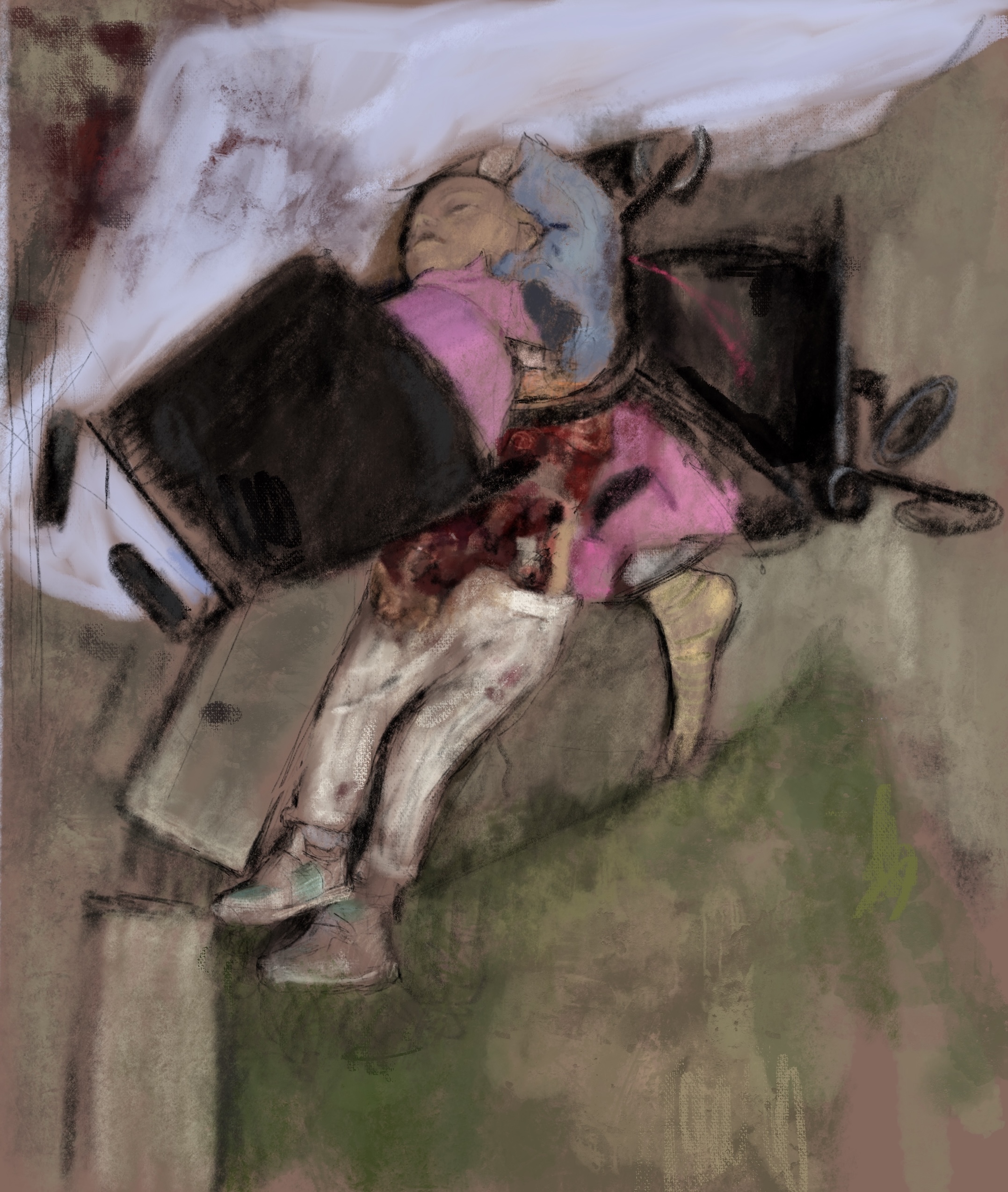 Sketch from eyewitness photo.One of most horrific #Russia/n terrorist attacks on civilians in #Ukraine that killed little Liza Dmitrieva the 4 y/o walking along a busy street with her mother who lost a leg with 23 killed incl 2 other children in #Vinnystia text @RonanLTynan