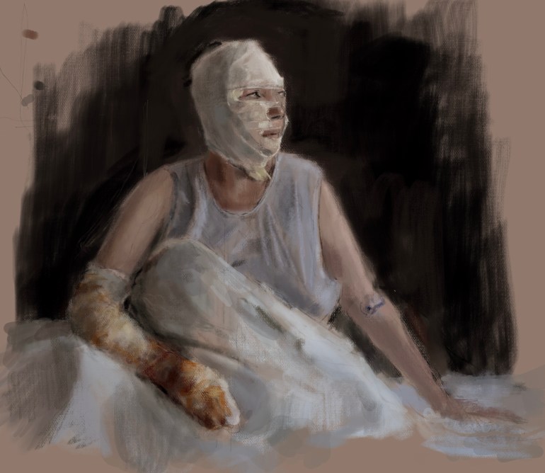 Sketch from eyewitness photo. A #Ukrainian woman bandaged and bloodied by #Putin #Russia ‘s cowardly, criminal, attacks on #civilians. This woman’s strength shines through her pain, she epitomizes #Ukraine️ ‘s indomitable spirit.Putin, you evil scum, you will lose.