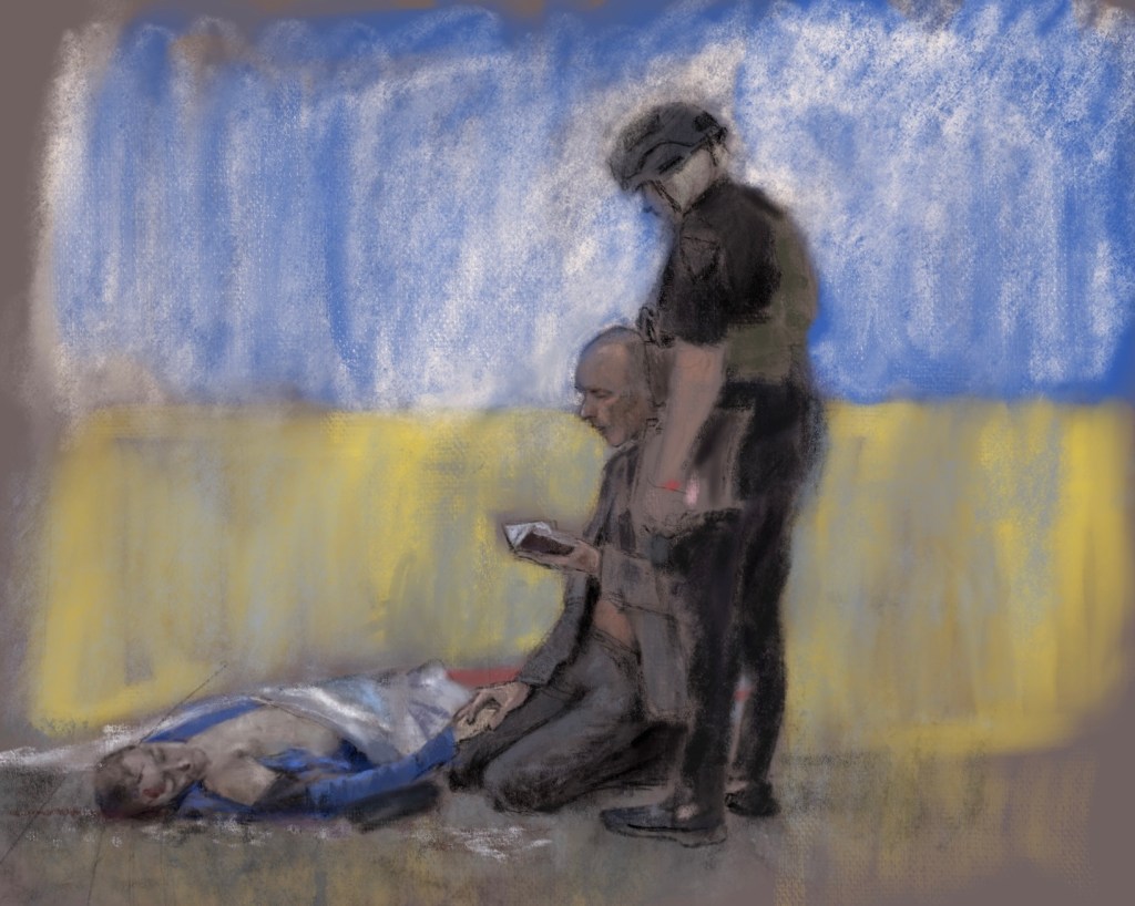 Sketch from eyewitness photo. While drawing this heart wrenching scene of a father praying over his murdered son #Kharkiv #Ukraine , #Putin #Russia commits a massacre of children in #Syria . Two parents united by #Putin ‘s unchecked #WarCrimes @johnsweeneyroar @michaeldweiss