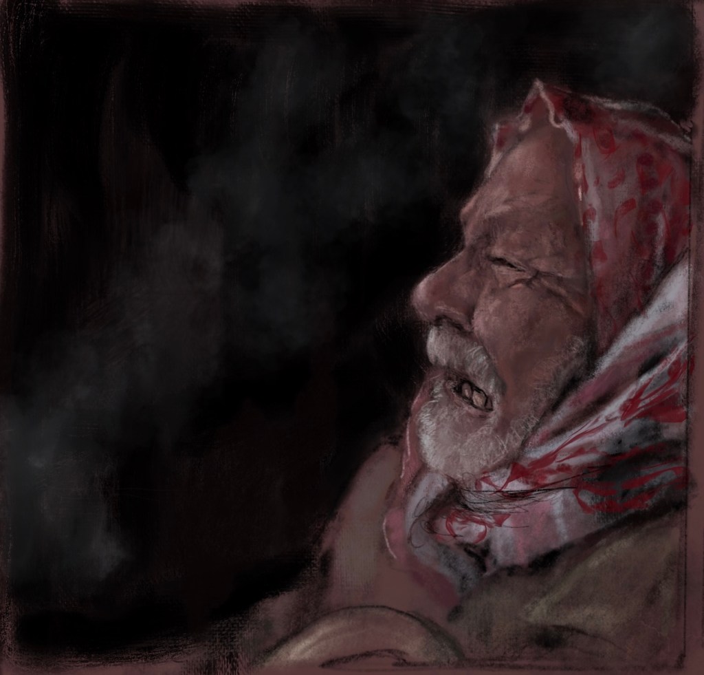 Sketch from eyewitness photo.Haji Mustafa al-Mando weeps as he is forced to leave his village due to #Assad #Russia ‘s genocidal destruction. A few days ago he died in a dusty camp, far from home. 0 August 19, 2022 Written by marcnelsonart Syria @RonanLTynan @MarkCutts @Charles_Lister @SyriaCivilDef @HolocaustMuseum Share this: Click to share on Facebook (Opens in new window) Facebook Click to share on X (Opens in new window) X Like Loading...