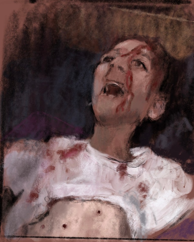 Sketch from eyewitness video (via @AlinejadMasih )A wounded #Iranian girl screams in pain, one of many #civilians targeted by govt. #MoralityPolice #Security forces in the #IranProtests2022 . Now #EbrahimRaisi calls army to quell protests. This is terrifying . #EyesOnIran