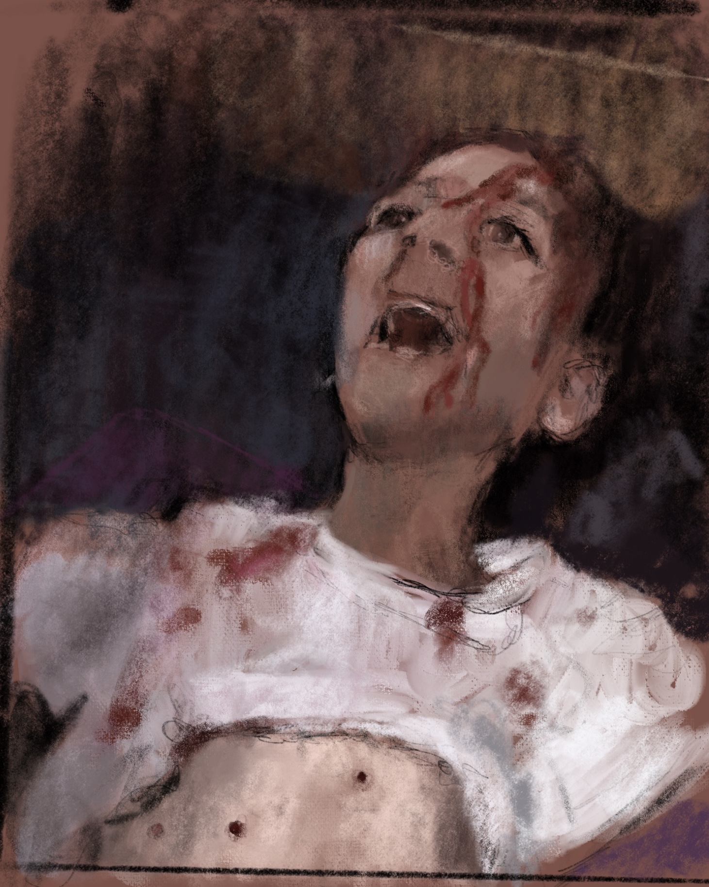 Sketch from eyewitness video (via @AlinejadMasih )A wounded #Iranian girl screams in pain, one of many #civilians targeted by govt. #MoralityPolice #Security forces in the #IranProtests2022 . Now #EbrahimRaisi calls army to quell protests. This is terrifying . #EyesOnIran