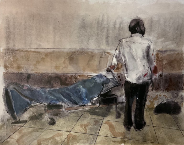 Sketch from eyewitness photo (incl. #ink #gouache ) . A father says a last goodbye to his son, murdered 10/10 by #Assad #Putin #Russia attack on a residential area. @UN considering #Russia n #WarCrimes in #Ukraine must acknowledge the thousands of crimes still happening in #Syria