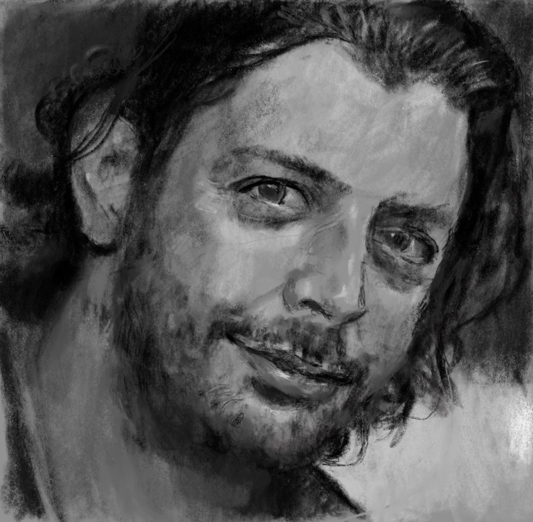 Sketch. Shamel Al-Ahmad, #Syria n photojournalist, activist. Shamel chose to remain in #Aleppo and support freedom and democracy. He and his wife were murdered in an #Assad airstrike. One of a series of portraits in collab with musician Dylan Connor for his “Unsung Heroes” project.