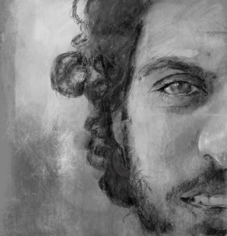Sketch. Abdul Baset al-Sarout. Sarout, was a #Syria n star soccer player. When the revolution began, Sarout led peaceful protests in song. When his 4 brothers were killed by #Assad forces, Sarout fought courageously with the #FreeSyria n forces. He died from battle wounds in 2019. From the “Unsung Heroes” project with Dylan Connor Music