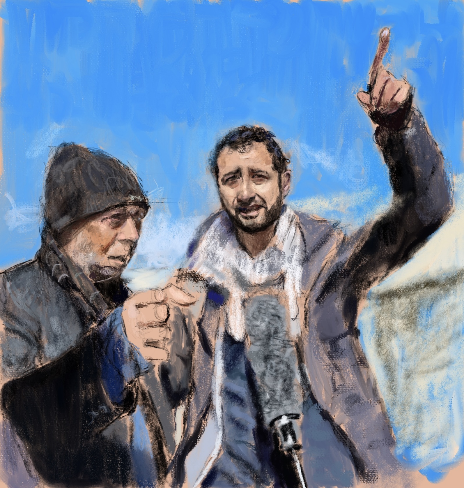 Sketch from eyewitness photo. My friend Mouaz Moustafaof the Syrian Emergency Task Force translates for @Rsherlock (NPR)“This man broke my heart in liberated #Syria where the @UN in coordination with #Assad didn’t send anything to help. He lost his entire family under the rubble.”-Mouaz M.