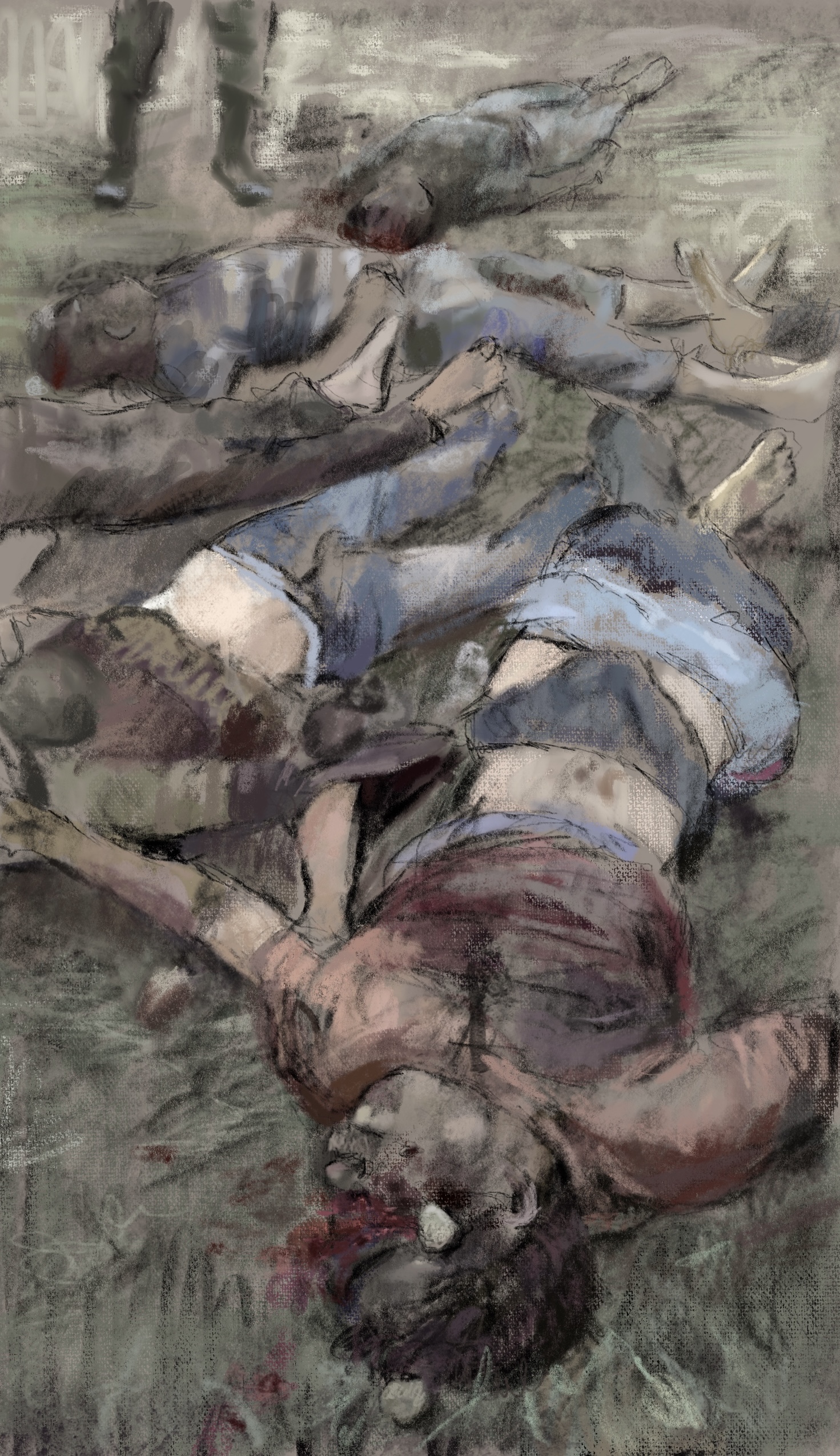Sketch from eyewitness photo. Civilians, apparently stoned to death by #Assad thugs for seeking freedom from oppression. It is absolutely VITAL that @POTUS refuses to normalize relations with #Syria while a genocidal madman is presiding over countless war crimes!