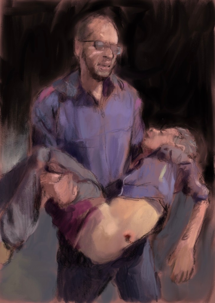 Sketch from eyewitness video. As hellish images of injured and murdered #Palestinian civilians pour in from #Gaza ,I find it impossible to stay silent, to be scared of offending voices perpetuating the false dichotomy of ‘either you support #IDF or you support #Hamas #WarCrimes