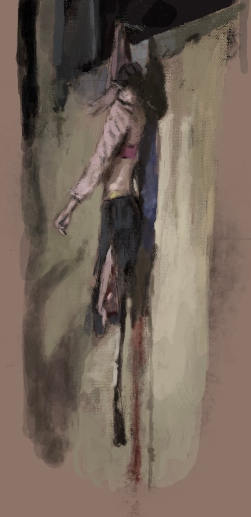 Sketch from eyewitness photo.True HORROR in #Rafah #Gaza as the shattered, torn, body of a young girl (Husouna family) hangs from a wall, blown from her tent by #IDF #Israel attacks. 60,000 CHILDREN ARE AT RISK! #CEASEFIRE_NOW 0 February 13, 2024 Written by marcnelsonart Share this: Click to share on Facebook (Opens in new window) Facebook Click to share on X (Opens in new window) X Like Loading...