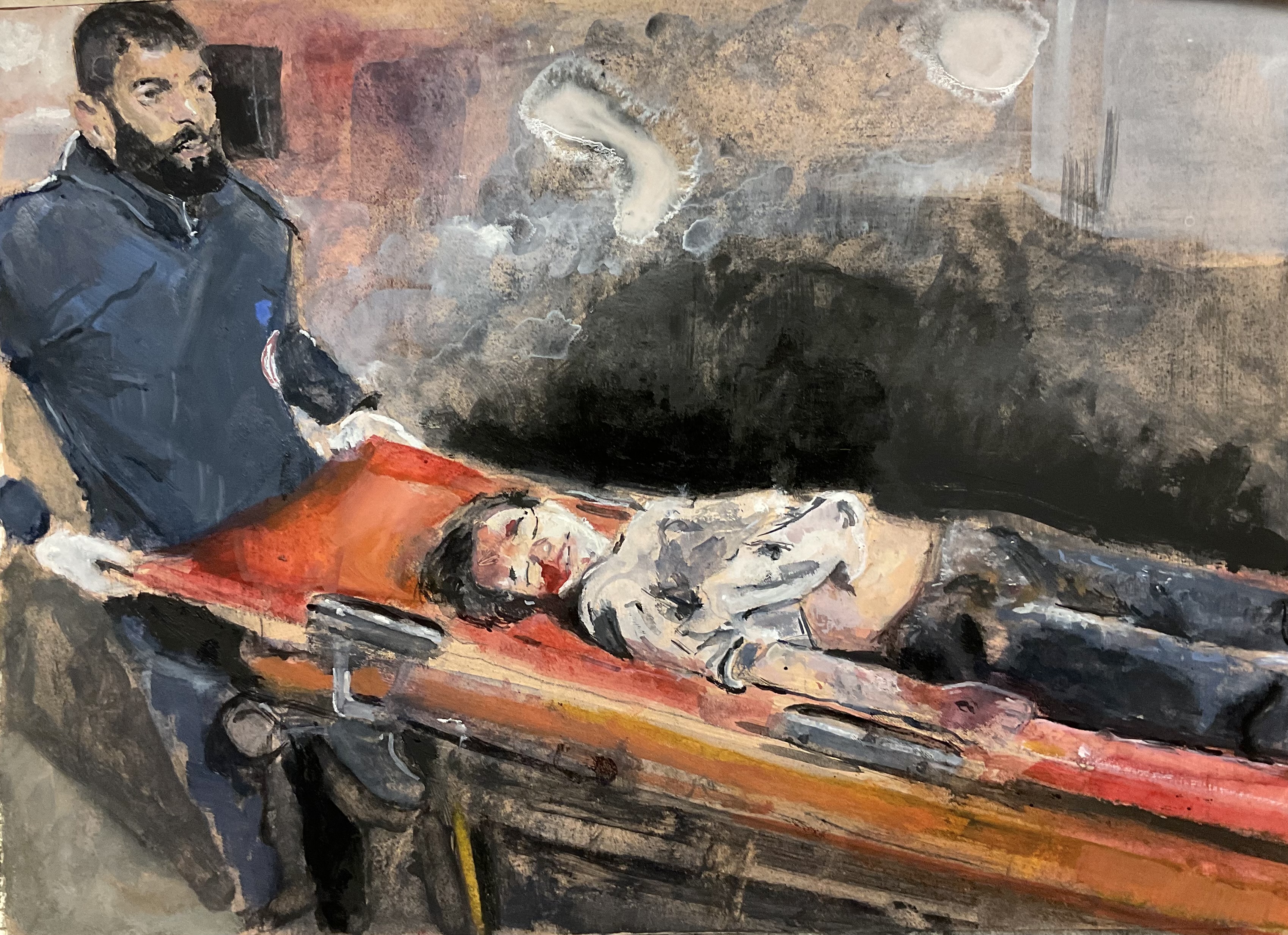 Sketch from eyewitness photo (#gouache) .A medic in #Gaza desperately tries to save the life of a young girl from the Hajj family. Her house was targeted by #IDF warplanes. #NetanyahuWarCriminalinfo via @RamAbdu@RamiJarrah @EyeonPalestine @hrw @ajplus @FARED_ALHOR @aiww
