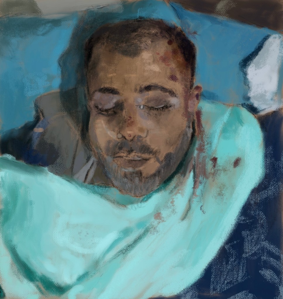 Sketch from eyewitness photo.Yesterday #Russian #Putin forces with #Assad and #Iranian murdered a nurse, Zakaria Al-Akhen in #Idlib #Syria . Targeting schools, hospitals, and healthcare workers, like #Israel in #Gaza , is a war crime!@HadiAlabdallah @Charles_Lister @badiucao