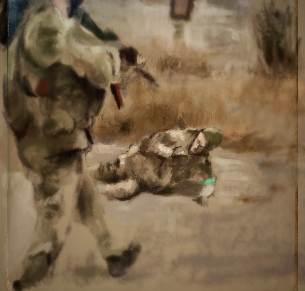 Sketch from eyewitness video.A Russian soldier murdering an unarmed #Ukrainian soldier. If not for #Putin ‘s land/blood lust this man would be home with his family, living a normal life.@realDonaldTrump do not capitulate to this monster!This American NEVER WILL!@reflextv