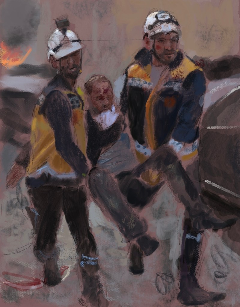 Sketch from eyewitness photo.As #Assad #Putin #Russia deliberately terrorize and target civilian populations in #Aleppo and #Idlib , the indomitable @SyriaCivilDef #WhiteHelmets risk their lives to save the most vulnerable. 0 December 1, 2024 Written by marcnelsonart Share this: Click to share on Facebook (Opens in new window) Facebook Click to share on X (Opens in new window) X Like Loading...