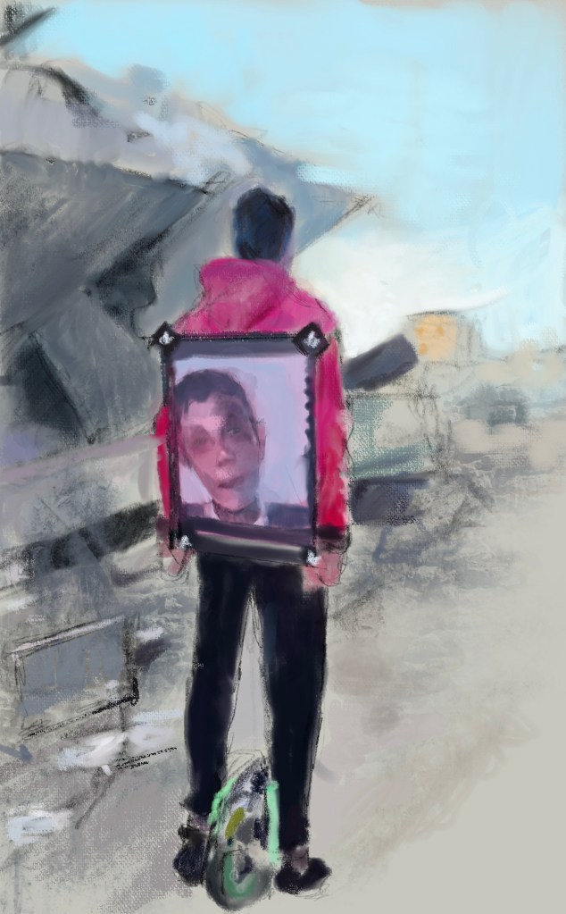 Sketch from eyewitness video from #Gaza16 days ago you were buried #MazenAlHamada , yet your courage, testimony, and image blazes across the world. This boy on a scooter, trying to survive a #genocide in #Gaza, carries your photo.You are an inspiration, a light in the dark.