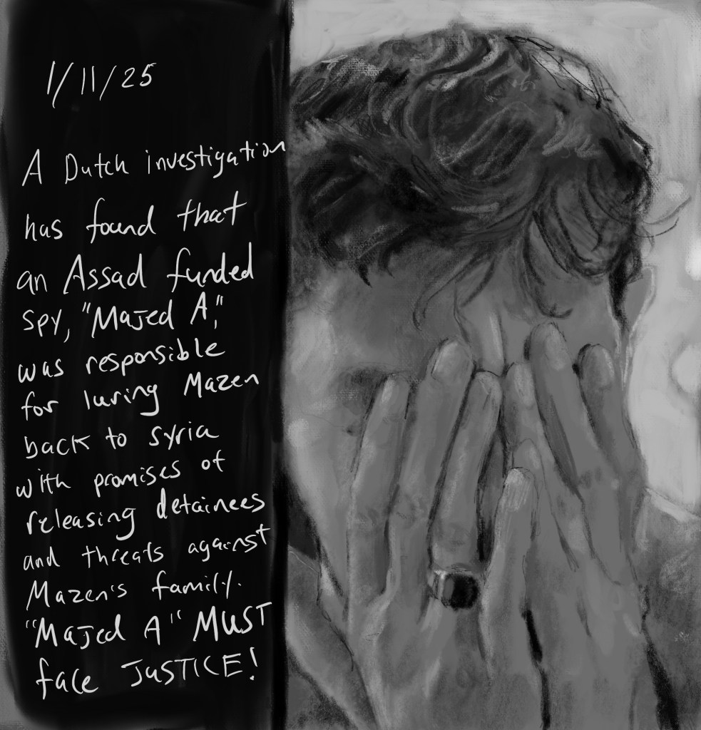 Sketch from eyewitness video, report via @MiddleEastEye .Dear #MazenAlHamada , 30 days after your burial, we are discovering the identity of the monsters who murdered you and thousands of other free #SyriansThey will face justice. 0 January 11, 2025 Written by marcnelsonart Justice4Mazen Justice4Syria Share this: Click to share on Facebook (Opens in new window) Facebook Click to share on X (Opens in new window) X Like Loading...