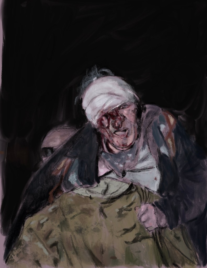 sketch from eyewitness photo. attack on #Kyiv #Ukraine 2/24/25I am an American. I am also a human with values. I am disgusted by our cowardly president #Trump , and his collusion with #Putin.Everyday I will post a sketch documenting #Putin ‘s war crimes.