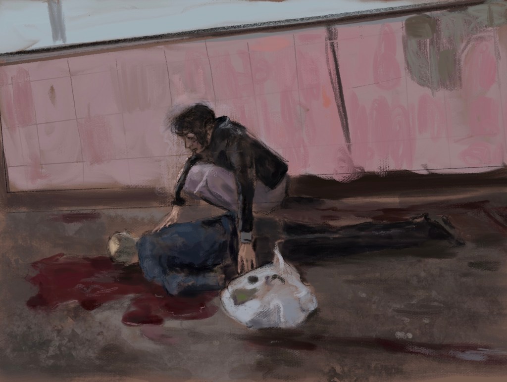 sketch from eyewitness photo (Bernat Armangue @AP) . A #Ukrainian woman trying to save her husband.I am an American.I am disgusted by our cowardly president #Trump , and his collusion with #Putin.Everyday I will post a sketch documenting #Putin ‘s war crimes.