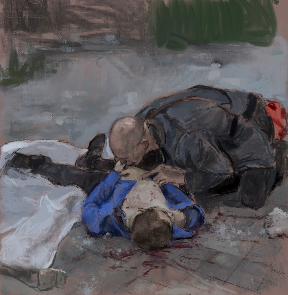 sketch from eyewitness photo. A father kisses the hand of his murdered son #UkraineI am an American. I am also a human with values. I am disgusted by our cowardly president #Trump , and his collusion with #Putin.Everyday I will post a sketch documenting #Putin ‘s war crimes.