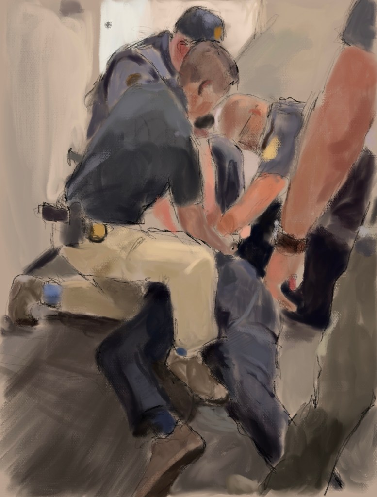sketch from eyewitness video via @CalltoActivismSenator #AlexPadilla is dragged from a press conference with #KristiNoem , thrown on the ground, and handcuffed. He had identified himself.This is #Fascism in action. Silencing detractors.WE WILL NOT BE SILENCED