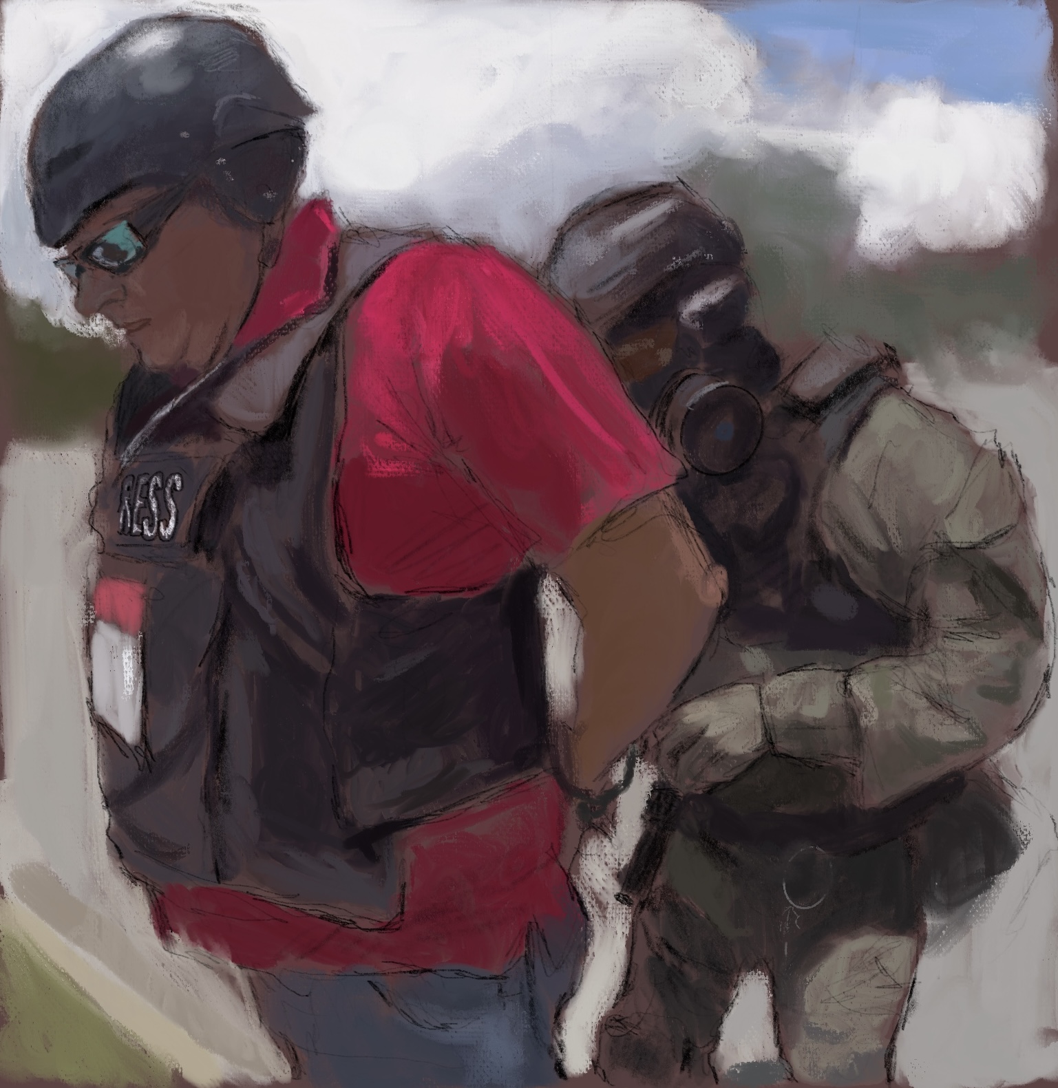 Sketch from eyewitness video.Mario Guevara, a Salvadoran journalist, who has been LEGALLY working in the U.S. for 20+ years, was arrested for covering a #NoKings protest in GA, and is currently being detained by #ICE and being threatened with deportation.A dangerous precedent!