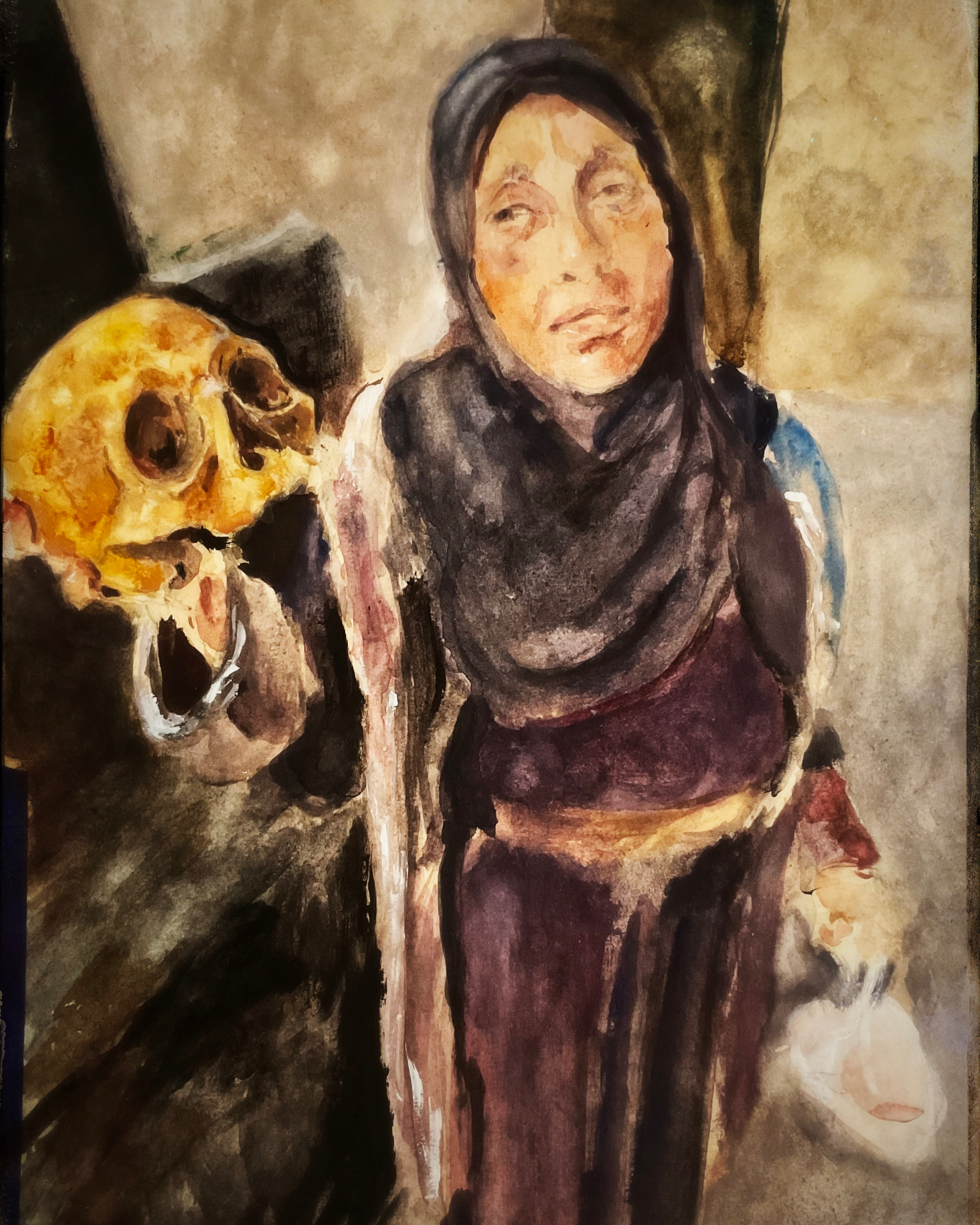 sketch from eyewitness photo (incl. #watercolor)Woman holding skull.When #Assad fell in December, his torture prisons were flooded with families hoping to find ANY inklings of their disappeared loved ones.Today thousands are still looking.@RanaKabbani54 @RonanLTynan @UN